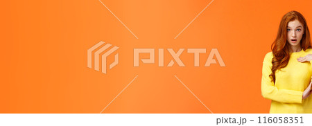 Who me. Frustrated and shocked, confused redhead woman accused, pointing herself and gasping stare astounded, feeling hurt person blame her, receive accusations, orange background