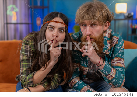Family man woman presses finger to lips makes silence hush sign do not tells gossip secret, quiet