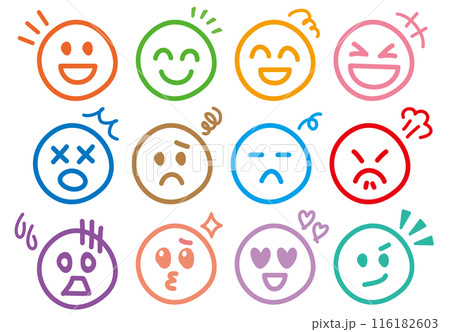 喜怒哀楽 さまざまな表情の手書き絵文字アイコン 顔文字 カラフル線画