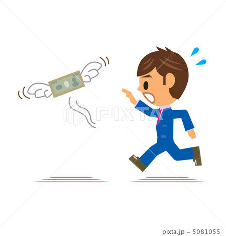 羽が生えて飛んでいくお金に驚く人物のイラスト
