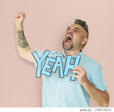 Woman Smiling Happiness Holding Comic Word Yeah Portrait