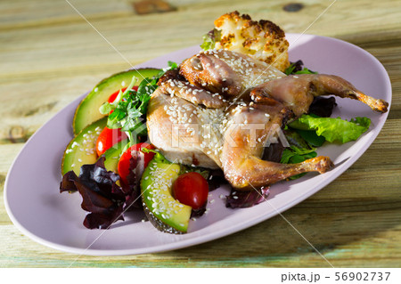 Salmon fish and green aspargus, cherry tomatoes and fennel
