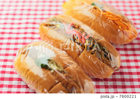 テーブルの上の焼きそばパン