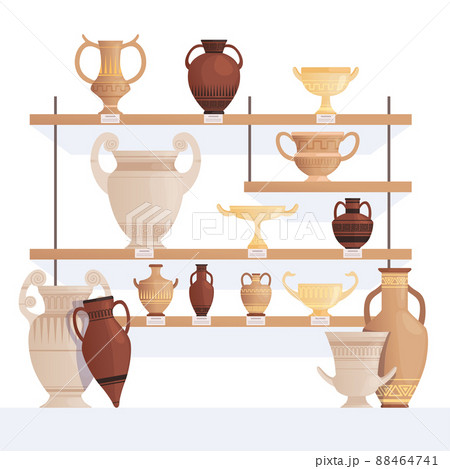Old jug on shelves. Antique vessel in museum history clay cups and amphoras cartoon concept