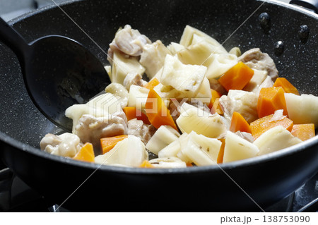 深めのフライパンで加熱中の鶏もも肉と根菜