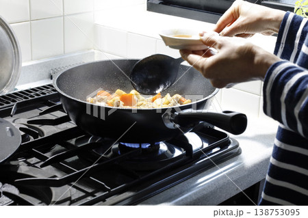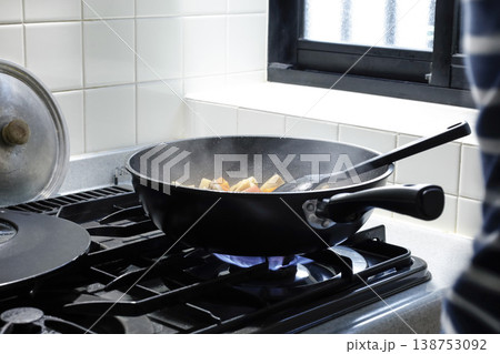 深めのフライパンで料理を作る様子