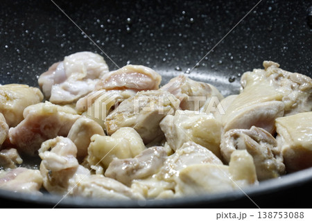 深めのフライパンで加熱中の鶏もも肉