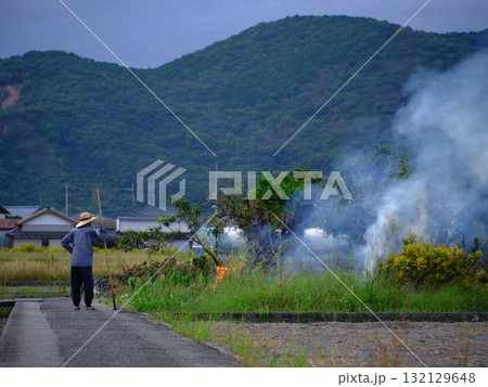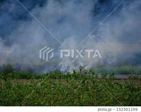 草むら野焼きの炎と煙
