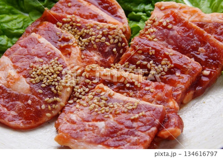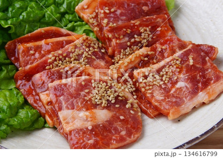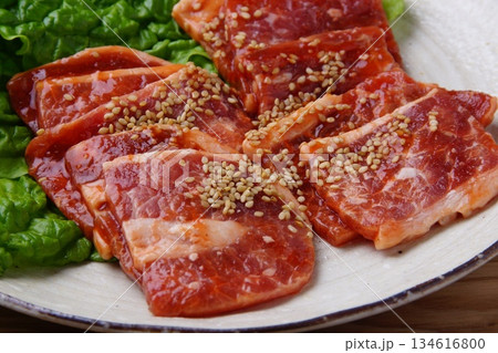 お皿の上の味付き牛バラ肉