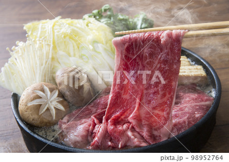 明治時代の昔ながらの牛鍋、すき焼き、和牛を黒い鉄鍋で焼いている様子、隣の大皿に野菜