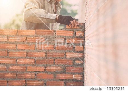 Brickwork by construction workers at the construction site. Workers laying the clay brick and stacked it together using mortar to form the wall.