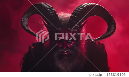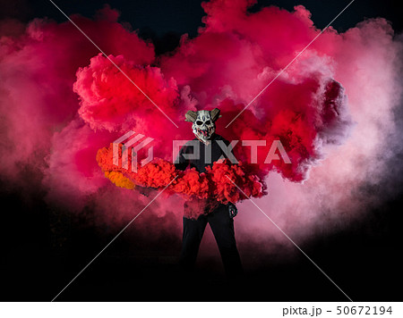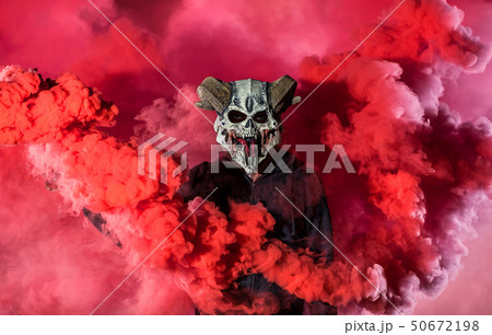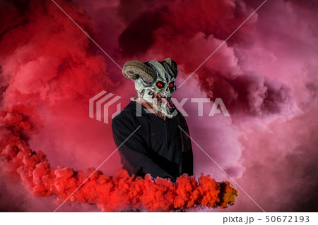 Devil with scary mask surrounded by red smoke