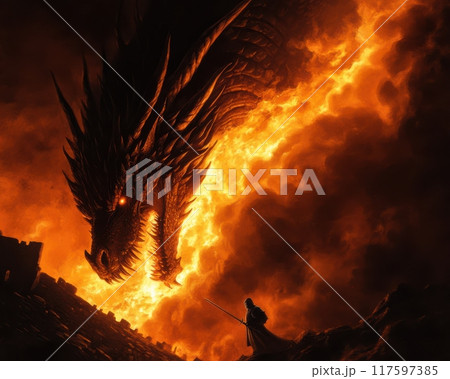 A dragon is depicted in a fiery blaze, with a man standing in front of it. Scene is intense and dramatic, as the dragon appears to be a formidable foe. The man is holding a sword
