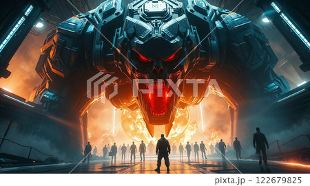 Giant monster emerging from futuristic hangar threatening humanity