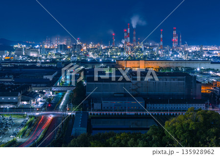 日本 岡山県倉敷市、亀島山花と緑の丘公園からの水島コンビナートの工場夜景