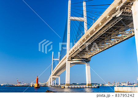 朝日に照らされる横浜ベイブリッジ、見上げた横浜ベイブリッジ、快晴、横浜のシンボル