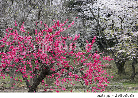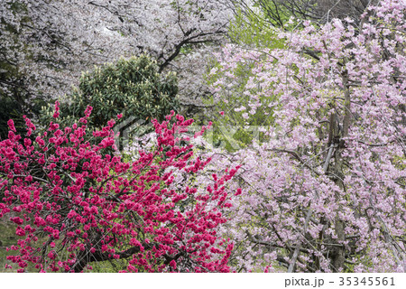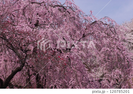 神奈川県三ッ池公園枝垂れ柳とピンクの桜の共演