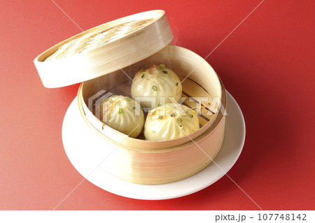 蒸籠で蒸された熱々小籠包を白背景で撮影