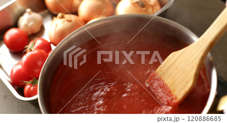 調理中 煮込む トマトソース