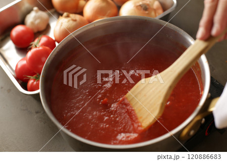 調理中 煮込む トマトソース