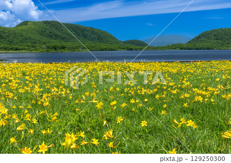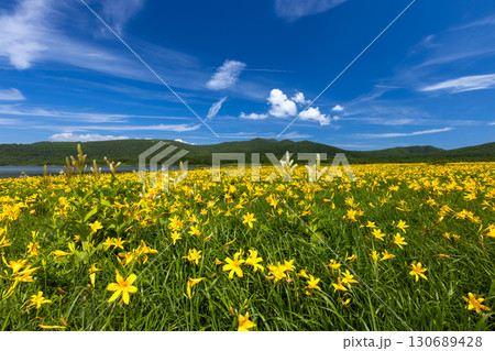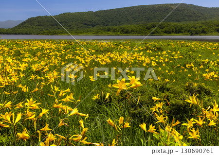 福島県喜多方市熊倉町雄国 雄国沼湿原を覆う満開のニッコウキスゲ群生と周りの山々の緑と青空