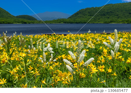福島県喜多方市熊倉町雄国 雄国沼湿原の満開のニッコウキスゲと白いコバイケイソウと背景の西吾妻山の景色