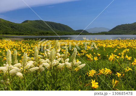 福島県喜多方市熊倉町雄国 雄国沼湿原の満開のニッコウキスゲと白い綿のようなコバイケイソウ