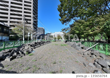 肥後熊本古城と崩落石垣を保管している様子