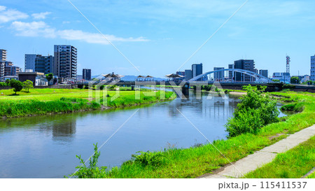 うららかな青空日和に映える熊本駅周辺風景(東口駅前・交通機関)【白川河川敷周辺風景】