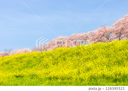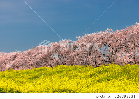 埼玉県熊谷市河原町 荒川土手にソメイヨシノの桜並木と菜の花が咲き誇る熊谷桜堤