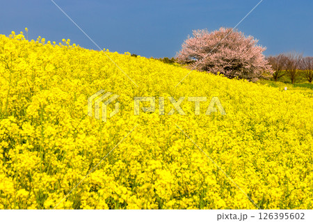 埼玉県熊谷市河原町 荒川土手の熊谷桜堤 一本桜と一面の菜の花畑