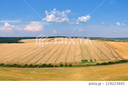 Aerial landscape view of yellow cultivated agricultural field with ripe wheat on bright summer day