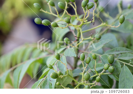 カレーリーフの熟していない青い果実(カレーベリー)別名:カラピンチャ、ナンヨウザンショウ