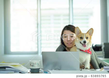 working at home due to covid-19 virus problem with Corgi dogs.teleconferencing Of team works at home