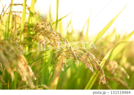 夕日を浴びて黄金色に輝く稲穂。収穫時期を迎えた田んぼの風景