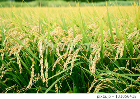 黄金色に実る稲穂のクローズアップ。色付き始めた秋分の頃の田んぼの風景