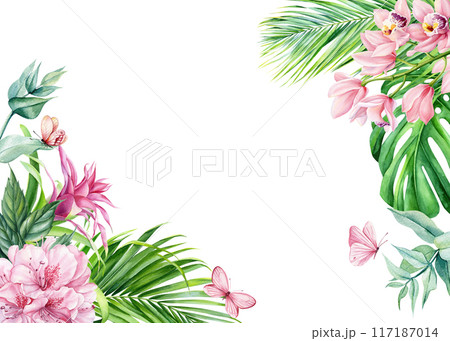 Tropical frame with palm leaves, flowers for sale poster, wedding card, party invitation. Watercolor templates isolated