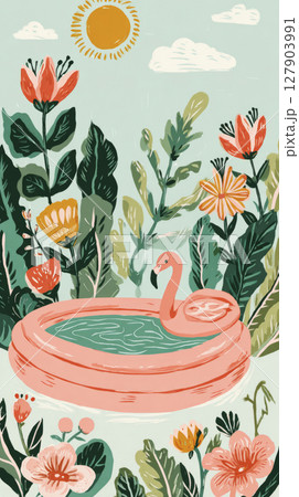 Bright inflatable water pool sits in a lush backyard, surrounded by blooming flowers and greenery. A pink flamingo floats atop the clear water, creating a lively summer atmosphere