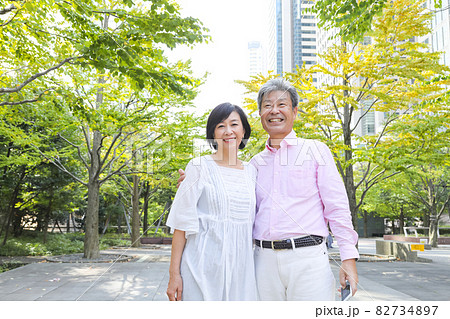 品川を散歩しながら仲良くくっついて会話するシニアカップル