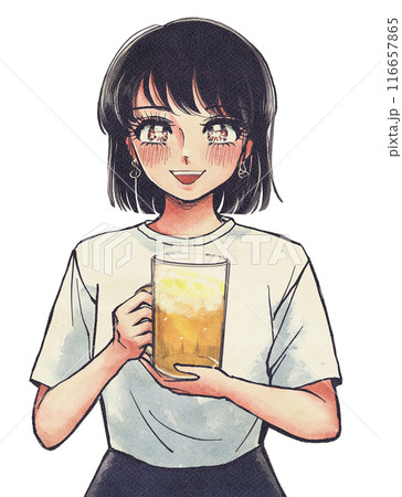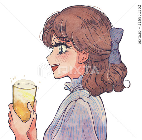 少女漫画風・ビールを持って微笑むお嬢様のイラスト