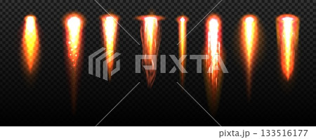 Rocket fire flame trails, flare energy rays and plasma beam explosion, spacecraft startup launch blaze. Isolated 3d vector set of realistic space jet, or shuttle straight, fiery streams, force power