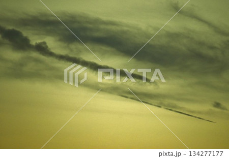 Black smoke trails, dark fog in the sky, black vapor from burning fire.