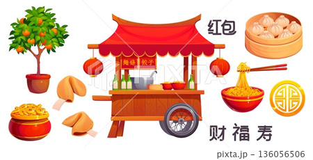 Chinese lunar New Year holiday icons of wealth and luck symbols, vector game assets. Chinese fortune cookies, mandarin tree and pot of golden coins money with Asian noodles in Chinatown market cart