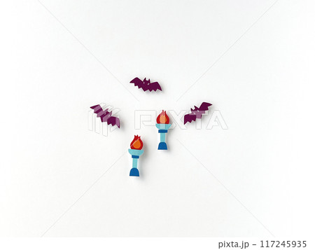 色画用紙イラスト工作:コウモリとかがり火、丸太のフレーム