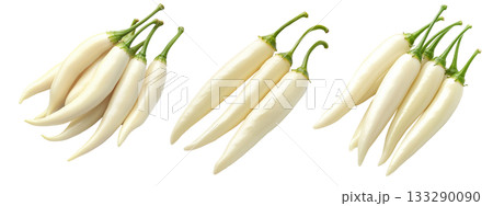 White chili peppers with green stems isolated on a white transparent background. Spicy food and cooking ingredient concept