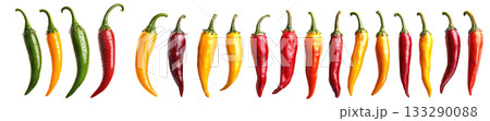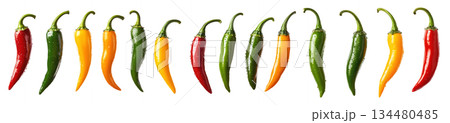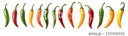Chili peppers in green, red, yellow, and orange with water droplets isolated on white transparent background.
