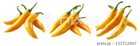 Yellow chili peppers with green stems isolated on a white transparent background.