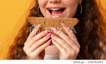 Woman smiles while holding a sandwich in front of her mouth against a yellow background