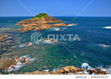 伊豆半島・南伊豆・爪木崎・爪木崎灯台から眺める爪木島と青い海、周囲の岩礁・静岡県下田市(1)