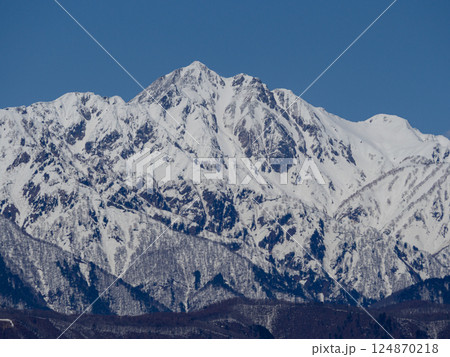 残雪の北アルプス 山並み 稜線 長野県小川村